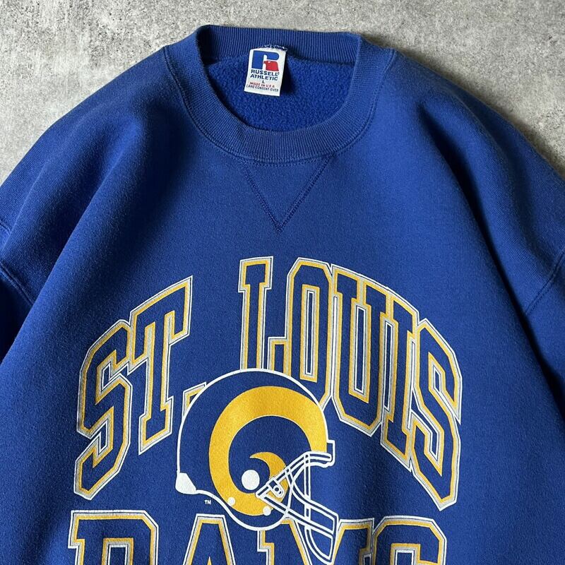 90s USA製 RUSSELL NFL セントルイス ラムズ 3段 プリント 前V スウェット トレーナー L / 90年代 アメリカ製 オールド ラッセル