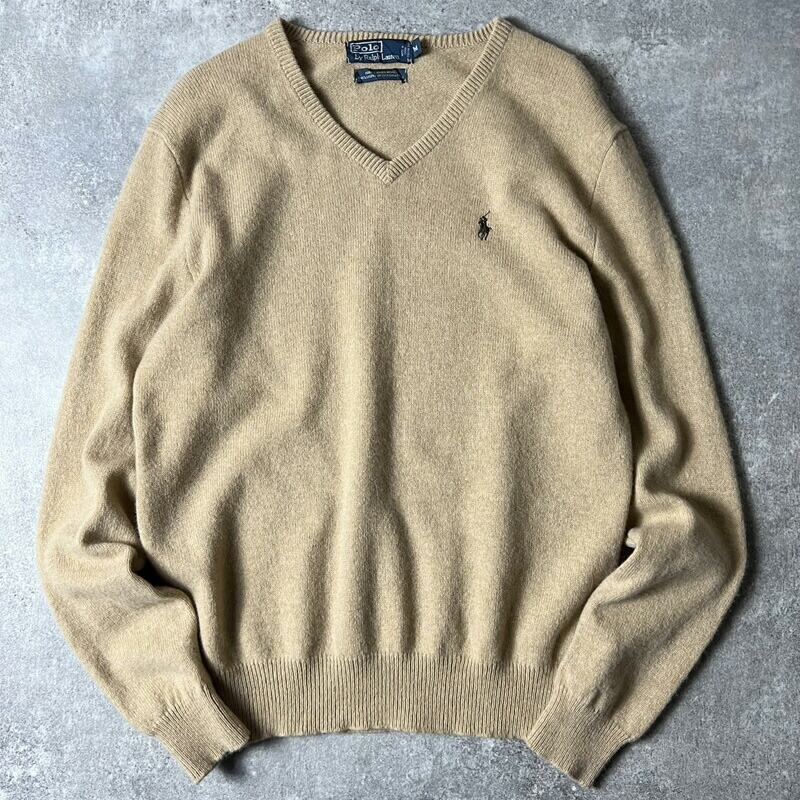 90s POLO RALPH LAUREN 長袖 ラムウール ニット セーター M / 90年代 オールド ポロ ラルフローレン ポニー刺繍 ベージュ