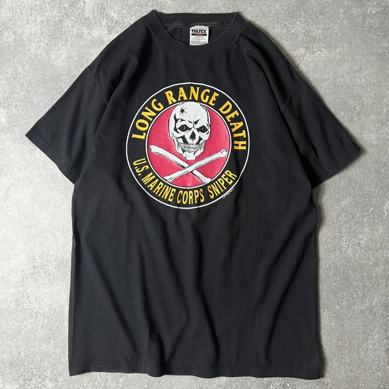90s USMC スナイパー スカル プリント 半袖 Tシャツ L / 90年代 マリンコープ ミリタリー 米軍 オールド ブラック
