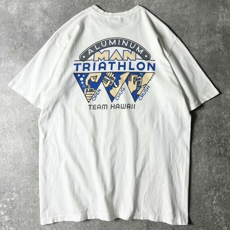 左胸に、「ALUMINUM MAN TRIATHLON」の配色の良いジョークプリント入り