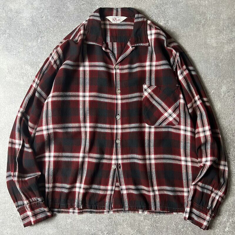 60s Renella チェック 長袖 レーヨン オープンカラー シャツ M / 60年代 ビンテージ 開襟 ボックス マルチカラー ループ留め