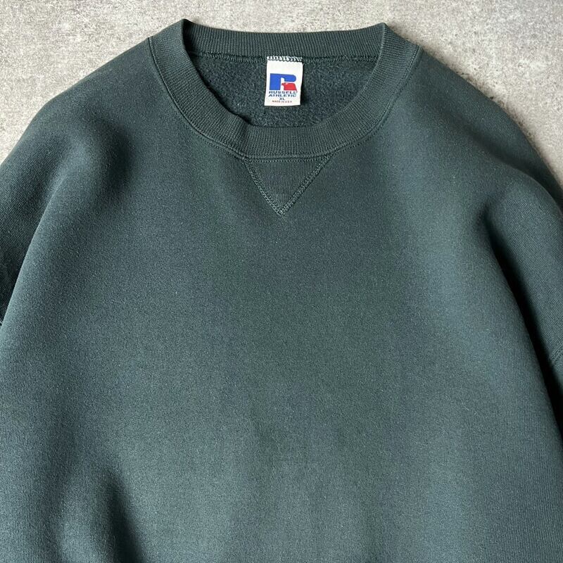 90s USA製 RUSSELL 無地 前V スウェット トレーナー XL / 90年代 アメリカ製 オールド ラッセル 裏起毛 グリーン スエット