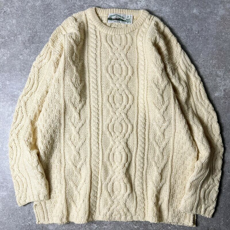 アイルランド製 aran crafts メリノ ウール フィッシャーマン ニット セーター M / アランクラフト アラン 生成り 薄黄