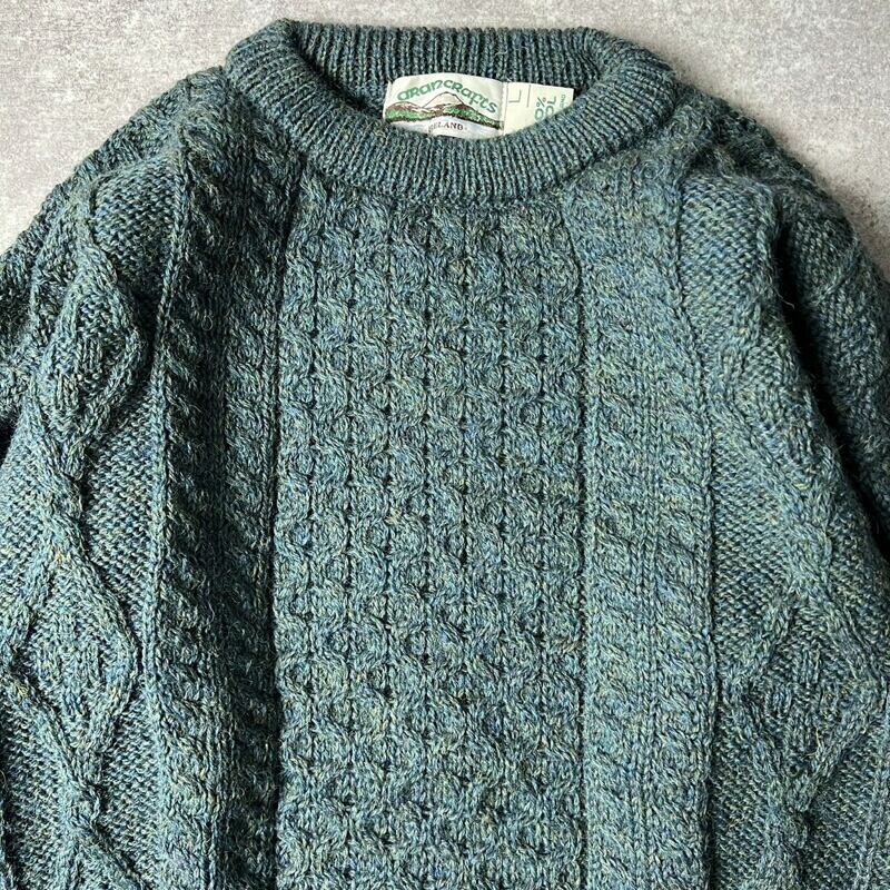 アイルランド製 aran crafts ウール フィッシャーマン ニット セーター L / アランクラフト アラン グリーン 無地