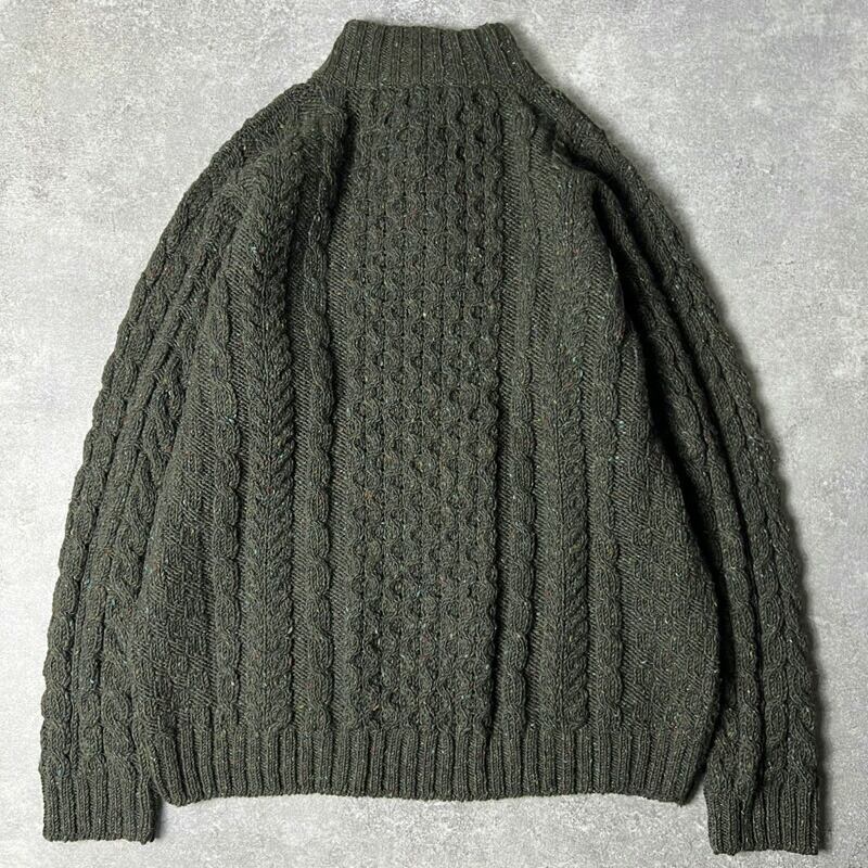 アイルランド製 LLBean ハイネック ウール フィッシャーマン ニット セーター XL / エルエルビーン アラン オリーブ グリーン ネップ