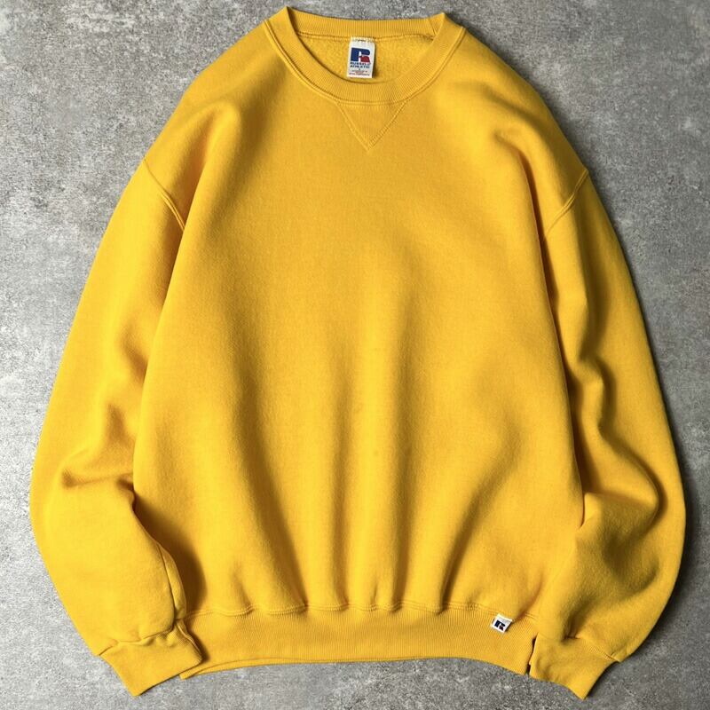 90s RUSSELL 無地 前V スウェット トレーナー L / 90年代 メキシコ製 オールド ラッセル 裏起毛 イエロー スエット