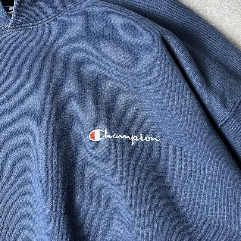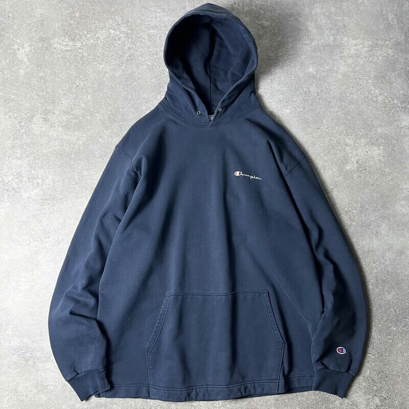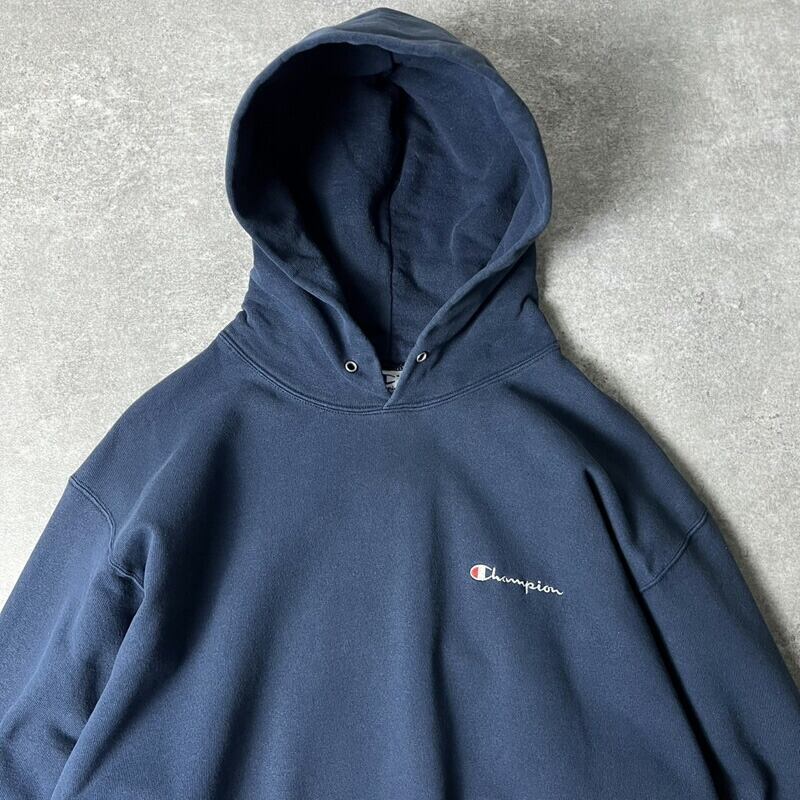 90s Champion ロゴ刺繍 スウェット フード パーカー XL / 90年代 チャンピオン オールド トレーナー スクリプト ネイビー