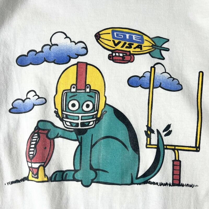 フロントにGTE VISAの飛行船とアメフトを楽しむ犬のキャラクタープリント