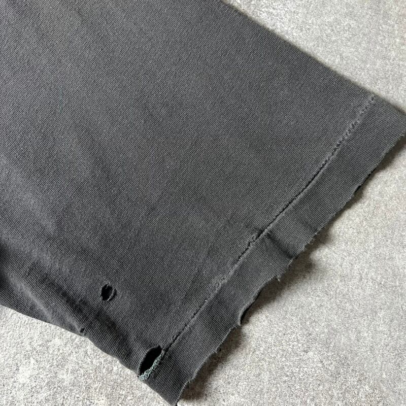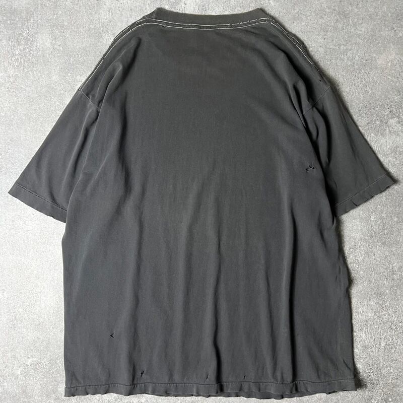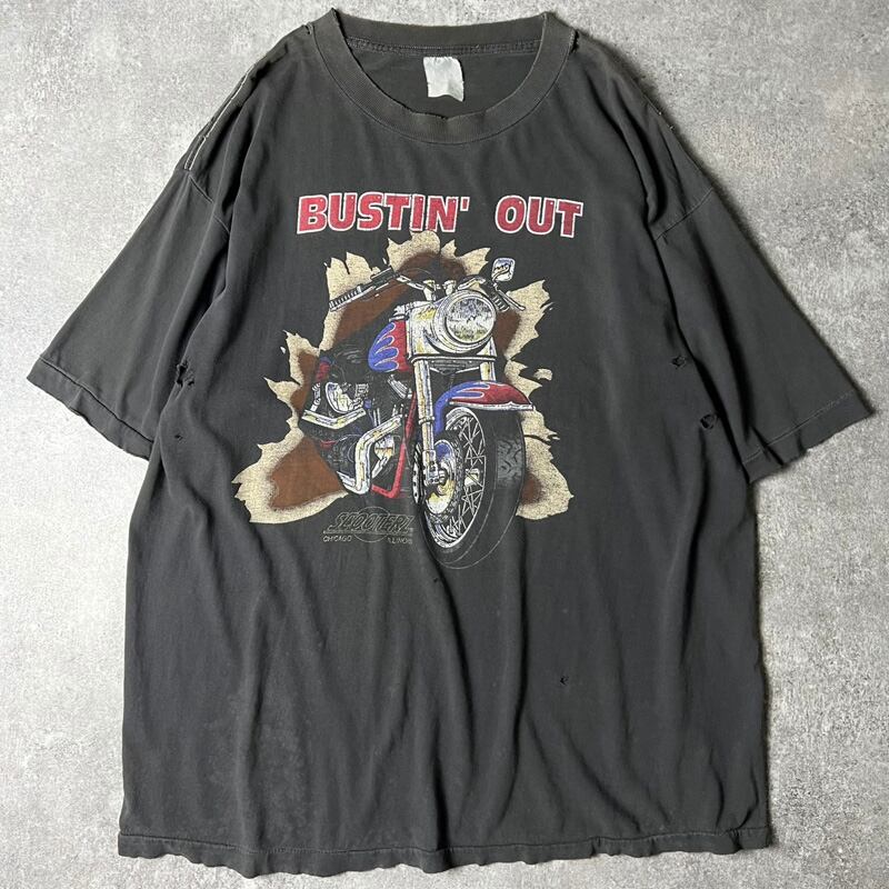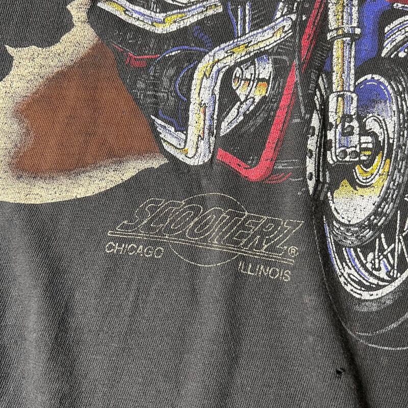 雰囲気系 90s バイク イラスト プリント 半袖 Tシャツ / 90年代 ハーレー ファイア 墨黒 ブラック 襤褸 ボロ シングル ステッチ