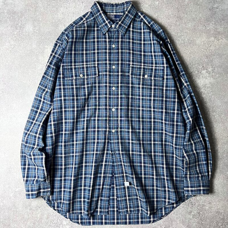 90s POLO RALPH LAUREN チェック 長袖 コットン シアサッカー シャツ L / 90年代 ポロ ラルフローレン オールド ブルー ネイビー