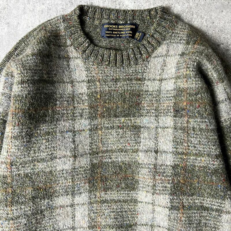 Brooks Brothers スコットランド製 チェック 切替 シェットランド ウール ニット セーター 38 / ブルックスブラザーズ オリーブ