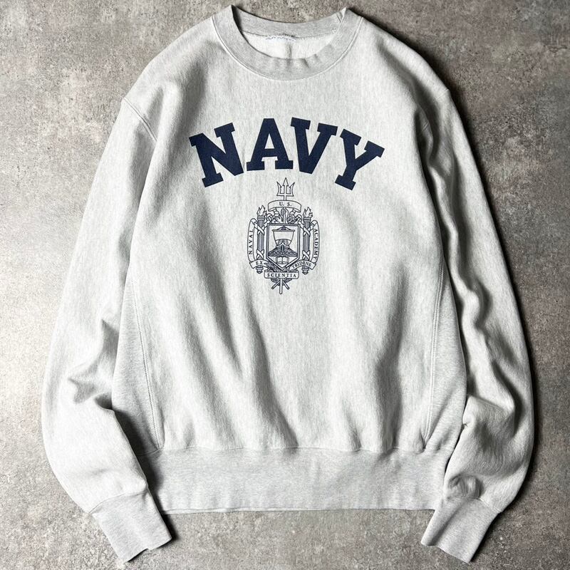 90s US NAVY 2段 プリント RWタイプ スウェット トレーナー / 90年代 アメリカ製 USNA NAVAL リバース 霜降り グレー