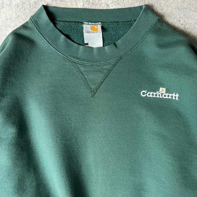 90s Carhartt ワンポイント ロゴ 刺繍 前V スウェット トレーナー / 90年代 カーハート オールド スエット 裏起毛 グリーン