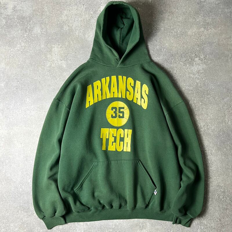 90s USA製 RUSSELL 3段 カレッジ プリント スウェット フード パーカー XXL / 90年代 アメリカ製 ラッセル トレーナー グリーン