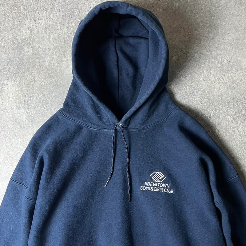 00s Champion 企業 ロゴ 刺繍 プレミアム リバースウィーブ スウェット フード パーカー XXL / 00年代 オールド チャンピオン 企業物 ネイビー