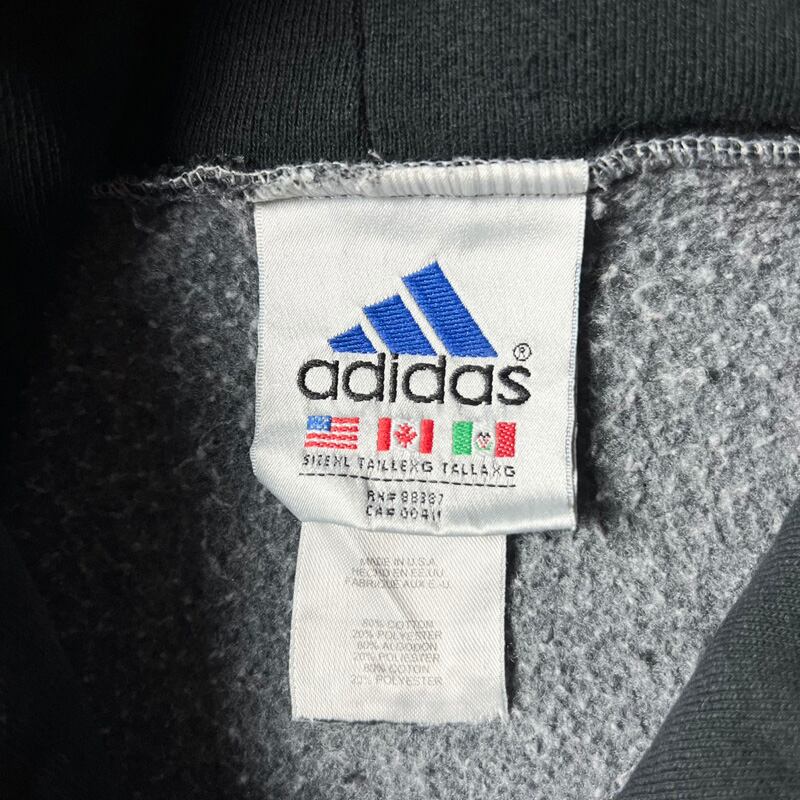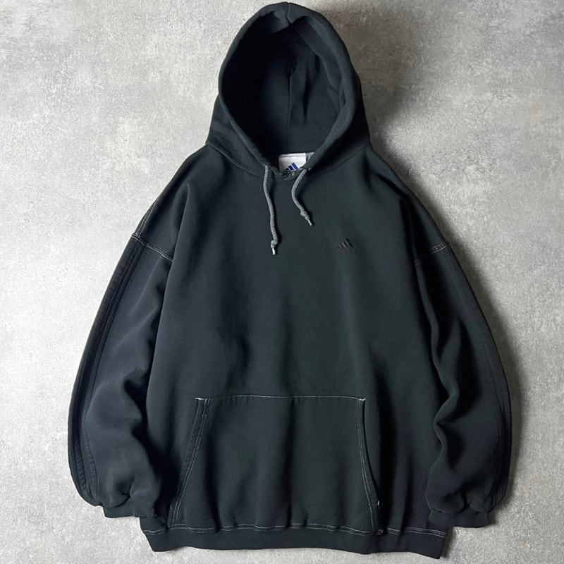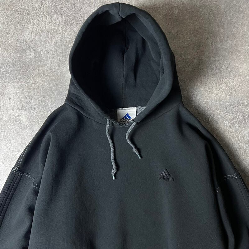 90s USA製 adidas ロゴ 刺繍 3ストライプ スウェット フード パーカー XL / 90年代 オールド アメリカ製 アディダス トレーナー ブラック 黒