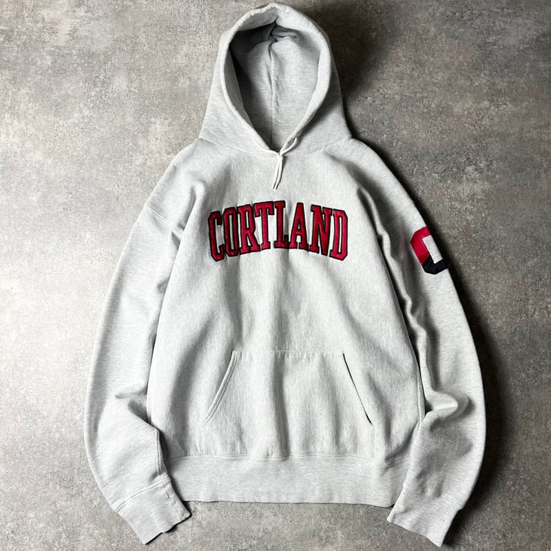 90s USA製 Cotton Exchange カレッジ 刺繍 RWタイプ スウェット フード パーカー / 90年代 アメリカ製 リバース トレーナー グレー