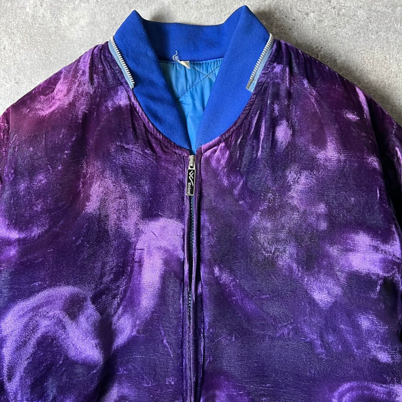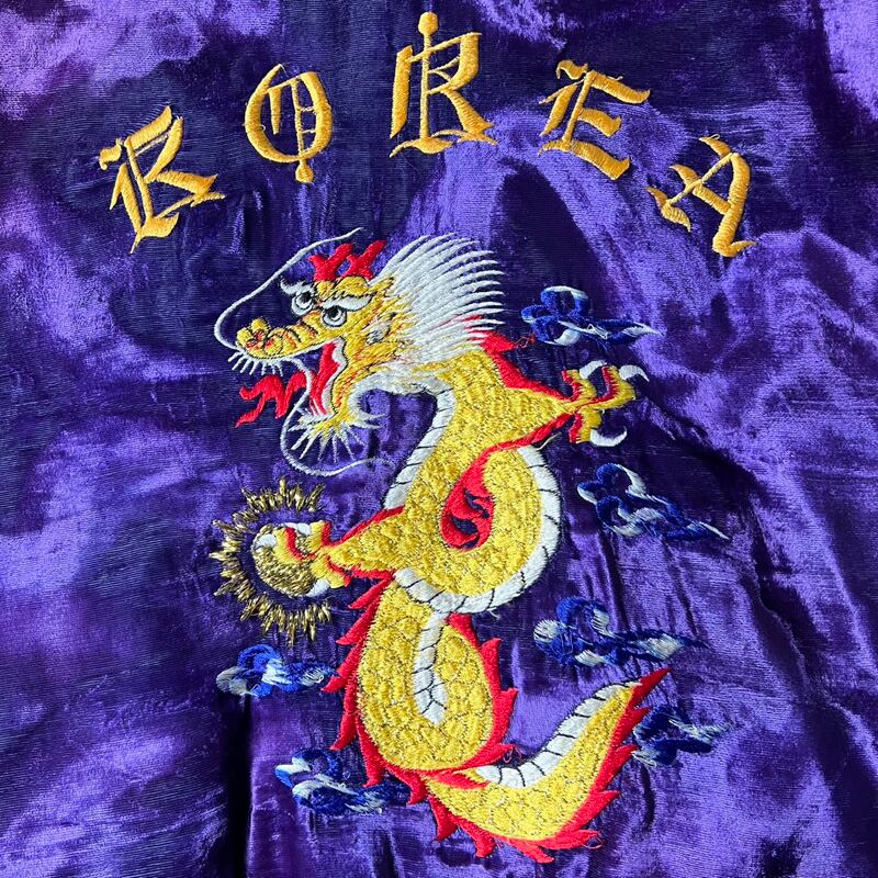 80s KOREA ドラゴン 刺繍 総柄 中綿入り 別珍 スーベニア ジャケット / 80年代 ビンテージ パープル ショート丈 コリジャン 龍