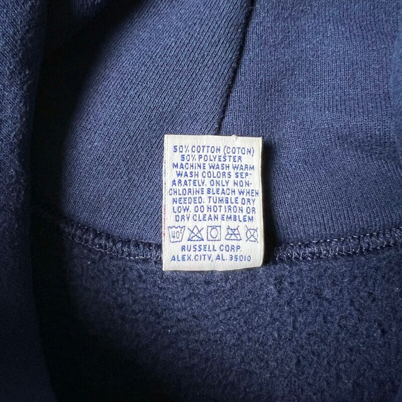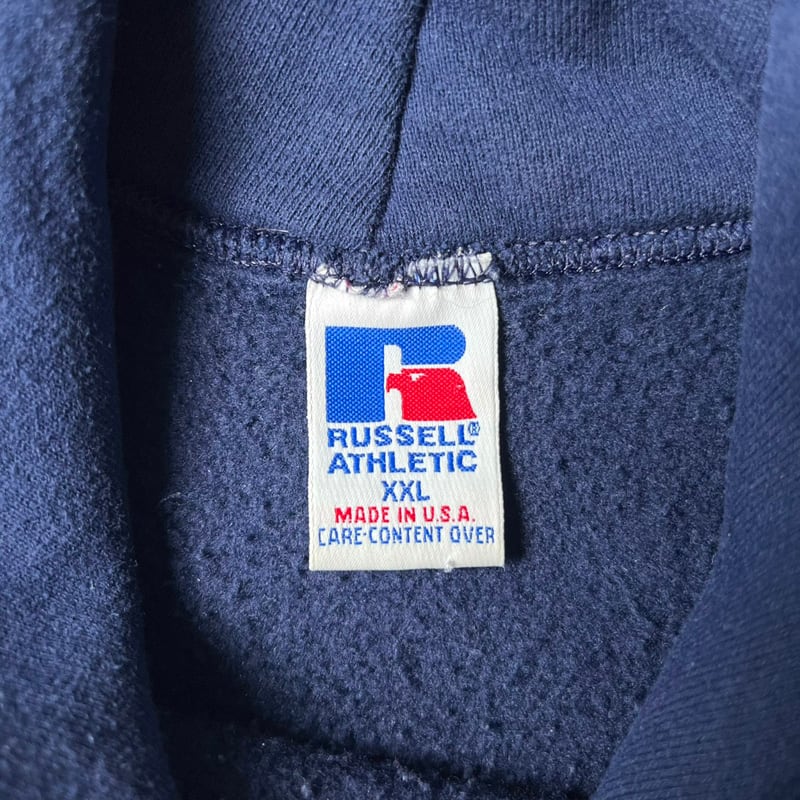 90s USA製 RUSSELL カレッジ ロゴ パッチ 刺繍 スウェット フード パーカー XXL / 90年代 オールド アメリカ製 ラッセル ネイビー トレーナー